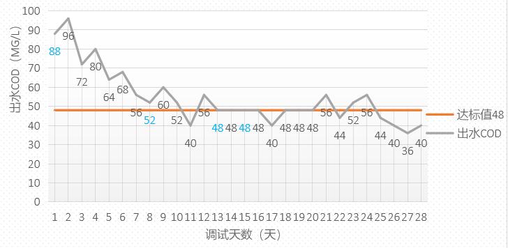 項目從投加我司(然益生物)專供菌種及在我司的專業技術人員調試后,調試初期出水COD略有波動,在二三次投加菌種調試后,數值基本在達標值以下。